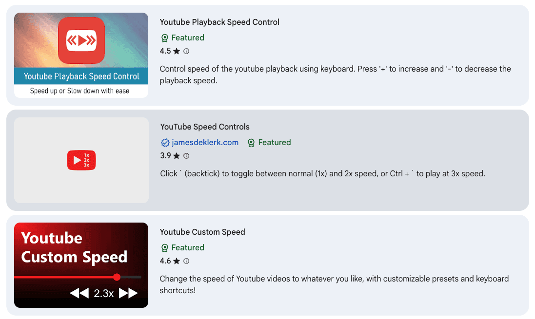 I found many Chrome extensions that display speed controls in the video player, reducing the number of clicks.
